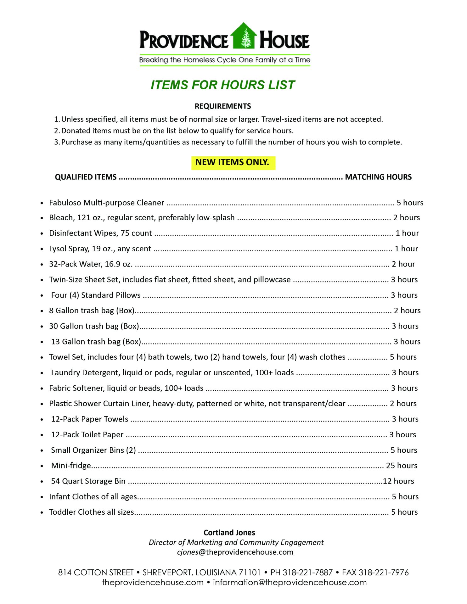 When you need community service hours and are not required to serve in person, consider Items for Hours. Simply purchase new items from the list to donate to Providence House and receive community service hours. (Items must be NEW) Not sure where to get some items? Here’s an Amazon Wish List.
